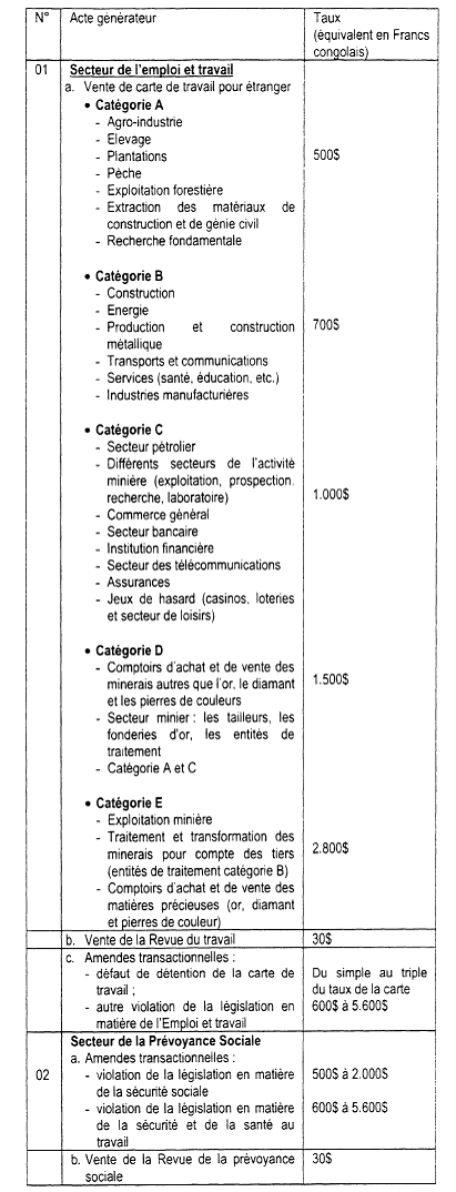 Les taux des droits  taxes et redevances à percevoir à l'initiative du Ministère de l'Emploi. Travail et Prévoyance Sociale sont fixés comme suit :
