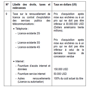 Le point 9 du tableau des taux des droits, taxes etredevances figurant à l’annexe de l’Arrêtéinterministériel n° CAB/MIN/PTNTIC/EON/JA/006/ 2018 et n° CAB/MIN/FINANCES/2018/015 du 15 février 2018 susvisé est modifié et complété commesuit :