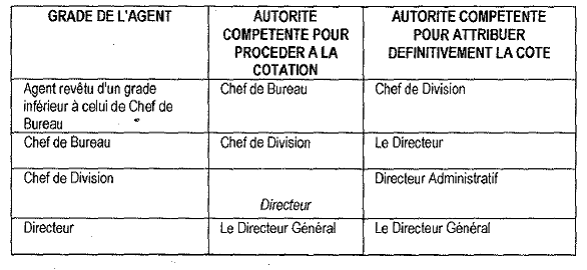 CHAPITRE VII: COTATION ET AVANCEMENT Article 35: La cotation est obligatoire pour tous les agents soumis au présent Règlement d'Administration. Elle a pour objet d'éclairer l'administration sur l'intégrité, le sens social, la conscience professionnelle et la compétence de l'agent. Le chef hiérarchique compétent établit un bulletin qui décrit brièvement les fonctions exercées par l'agent pendant l'année écoulée et sa manière de servir. Il y propose l'appréciation du mérite qu'il estime devoir être attribuée. L'appréciation du mérite est synthétisée par l'une des mentions suivantes: «Elite », «Très Bon », «Bon », «Assez Bon », « Médiocre ». Article 36 : L'autorité établit les bulletins de cotation et en transmet une copie à l'agent dans un délai de quinze (15) jours. L'agent peut introduire, par voie hiérarchique, dans les huit (8) jours de la réception de la copie du bulletin de cotation, un recours contre l'appréciation du mérite. La décision d'attribution définitive n'est pas susceptible de recours. Les autorités compétentes pour procéder à la cotation des agents de la REPERE et pour attribuer définitivement l'appréciation du mérite sont désignées comme suit: