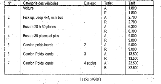 Il est institué des droits de péage pour tout véhicule empruntant l'axe routier Bukavu -Kamituga.