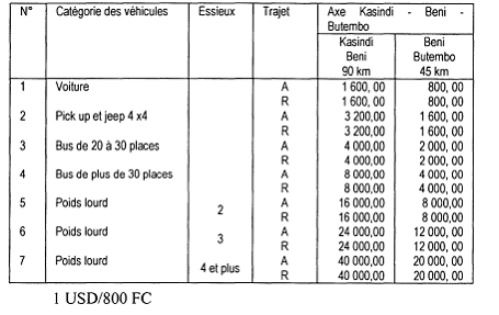 Ministère des Infrastructures, Travaux Publics et Reconstruction; Arrêté ministériel n°CAB/MIN-ITPR/008/KM/JL/2009 du 13 juillet 2009 portant fixation des droits de péage sur l'axe routier Kasindi- Butembo. Le Ministre chargé des infrastructures, Travaux Publics et Reconstruction; Vu la Constitution de la République; Vu la Loi n°08/006 du 07 juillet 2008 portant création d'un Fonds National d'Entretien Routier, en sigle « FONER » ; Vu le Décret n°08/27 du 24 décembre 2008 portant création d'un Etablissement Public dénommé Fonds National d'Entretien Routier «FONER »; Vu l'Ordonnance n°08/067 du 26 octobre 2008 portant nomination des Vice-premiers Ministres, Ministres et Viceministres; Vu l'Ordonnance n°71/078 du 26 mars 1971 portant Classification des Routes en République Démocratique du Congo; Vu l'Ordonnance n°08/073 du 24 décembre 2008 portant Organisation ct Fonctionnement du Gouvernement, modalités pratiques de collaboration entre le Président de la République et le Gouvernement ainsi qu'entre les Membres du Gouvernement, spécialement en article 19 ; Vu l'Ordonnance n° 08/74 du 24 novembre 2008 fixant les attributions des Ministères; Attendu que l'entretien, la maintenance des routes d'intérêt général ainsi que l'organisation du péage sont de la compétence du Gouvernement Central; Vu l'Arrêté interministériel n°09/CAB/MIN-ITPR/002/K.M/2009 du 06 mars 2009, n° CAB/FINANCES/DTS/ 2009 du 06 mars 2009, n°001/CAB/MIN/ECONAT & COM/2009 du 06 mars 2009 et 25 n°409/CAB/MIN/TVC/007/2009 du 06 mars 2009 portant fixation des taux, montants et modalités de perception des ressources du Fonds National d'Entretien Routier, FONER en sigle, spécialement en ses articles 13, 14, 15,16 et 17; Attendu qu'un péage de fait existe sur l'axe Kasindi-Butembo; Vu l'impérieuse nécessité d'assurer l'entretien permanent et ordonné dudit axe; Vu la nécessité et l'urgence; ARRETE Article 1 : Il est institué des droits de péage pour tout véhicule empruntant l'axe routier Kasindi-Butembo sur les tronçons Kasindi-Beni et Beni-Butembo. Article 2: Les taux des droits de péage sur les tronçons routiers dudit axe sont fixés par catégorie des véhicules conformément au tableau repris en annexe au présent Arrêté. Article 3: Sont exemptés du paiement des droits de péage: 1. les ambulances et les véhicules de lutte contre l'incendie; 2. les véhicules faisant des corbillards; 3. les véhicules de l'administration des ponts et chaussées et des Services Publics ayant la construction et l'entretien dans leur objet; 4. les véhicules militaires et de la police Nationale; 5. les véhicules de toute entreprise de génie civil ayant une activité directe sur la route concernée; 6. les véhicules officiels; 7. les cyclomoteurs et les vélos. Article 4: Toutes les dispositions antérieures et contraires sont abrogées. Article 5: Le Directeur Général du Fonds National d'Entretien Routier en sigle « FONER » est chargé de l'exécution du présent Arrêté qui entre en vigueur à la date de sa signature. Fait à Kinshasa, le 13 juillet 2009 Pierre Lumbi Okongo Annexe à l'Arrêté ministériel n° CAB/MIN-ITPR/008/KM/JL/2009 Droits de péage sur les tronçons routiers en terre Kasindi Butembo en Francs congolais
