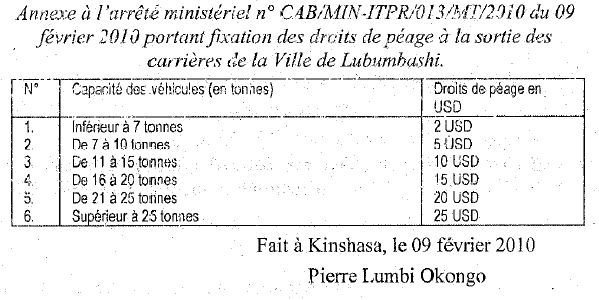 Arrête ministériel n° CAB/MIN-ITPR/013/MT/2010 du 09 février 2010 portant fixation des droits de péage à la sortie des carrières de la ville de Lubumbashi Le Ministre des Infrastructures, Travaux Publics et Reconstruction, Vu la Constitution de la République; Vu la Loi n°08/006 du 07 juillet 2008 portant création d'un Fonds National d'Entretient Routier, en sigle « FONER» ; Vu l'Ordonnance n°08/067 du 26 octobre 2008 portant nomination des Vice-Premiers Ministres, Ministres et Viceministres; Vu l'Ordonnance n° 08/073 du 24 décembre 2008 portant organisation et fonctionnement du Gouvernement, modalités pratiques de collaboration entre le Président de la République et le Gouvernement ainsi qu'entre les membres du Gouvernement, spécialement en son article 19 ; Vu l'Ordonnance n008/074 du 24 décembre 2008 fixant les attributions des Ministères; Vu le Décret 08/27 du 24 décembre 2008 portant création et statuts d'un établissement public dénommé Fonds National d'Entretient Routier, en sigle «FONER» ; Attendu que l'entretien, la maintenance des routes d'intérêt général ainsi que l'organisation du péage sont de la compétence du Gouvernement central; Vu l'Arrêté interministériel n° 09/CAB/MIN- ITPR/002/KM/2009 du 06 mars 2009, n° CAB/FINANCES/DTS/2009 du 06 mars 2009, n° 001/CAB/MIN/ECONAT/&COM/2009 du 06 mars 2009 et 409/CAB/MIN/TVC/2009 du 06 mars 2009, portant fixation des taux, montants et modalités de perception des ressources du Fonds National d'Entretien Routier, en sigle FONER» spécialement en ses articles 13, 14, 15, 16 et 17; Considérant que les véhicules provenant des carrières soumettent la chaussé des voiries urbaines à dégradation prématurée; Attendu qu'il y a lieu de règlementer le trafic des transports des matériaux de construction provenant de carrière de manière à faire participer cette catégorie d'usager de la route à l'entretient et à la protection des infrastructures routières; Vu l'impérieuse nécessité d'assurer la protection et l'entretien permanent et ordonné des voies de sortie des carrières ; Vu la nécessité et l'urgence ; ARRETE Article 1 : Il est institué des droits de péage aux sorties des carrières pour tout véhicule transportant les matériaux de- construction extrait de carrières; Article 2: Les taux de droits de péage aux sorties des carrières sont fixés conformément au tableau replis en annexe au présent Arrêté. Article 3 : Toutes les dispositions antérieures et contraires sont abrogées. Article 4 : Le Directeur général du Fonds National d'Entretient Routier, en sigle «FONER» est .chargé de l'exécution du présent Arrêté qui entre en vigueur à partir de la date de sa signature. Fait à Kinshasa, le 09 février 2010 Pierre Lumbi Okongo