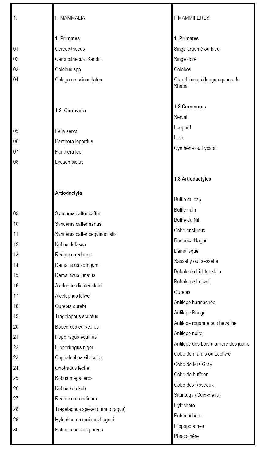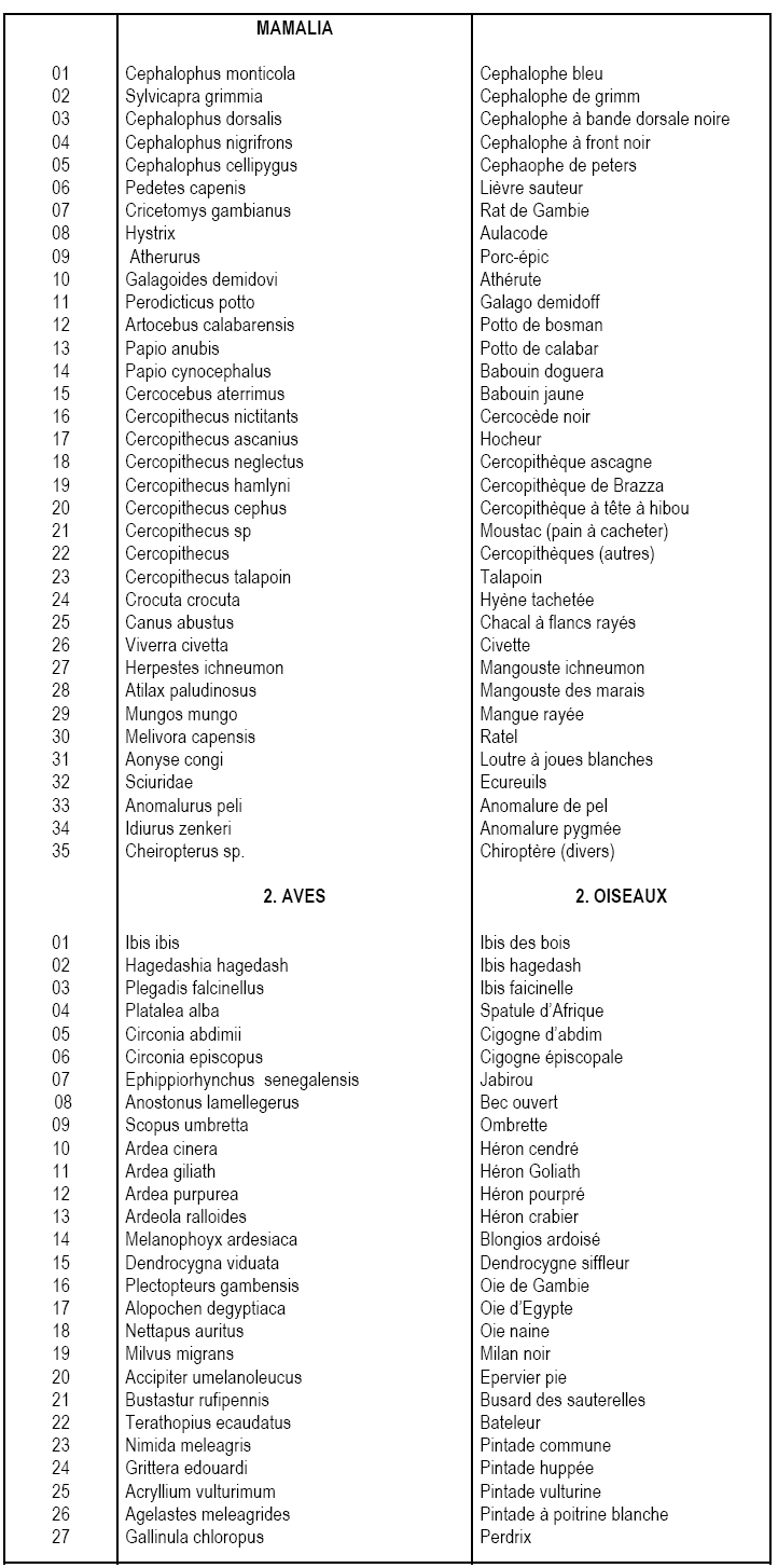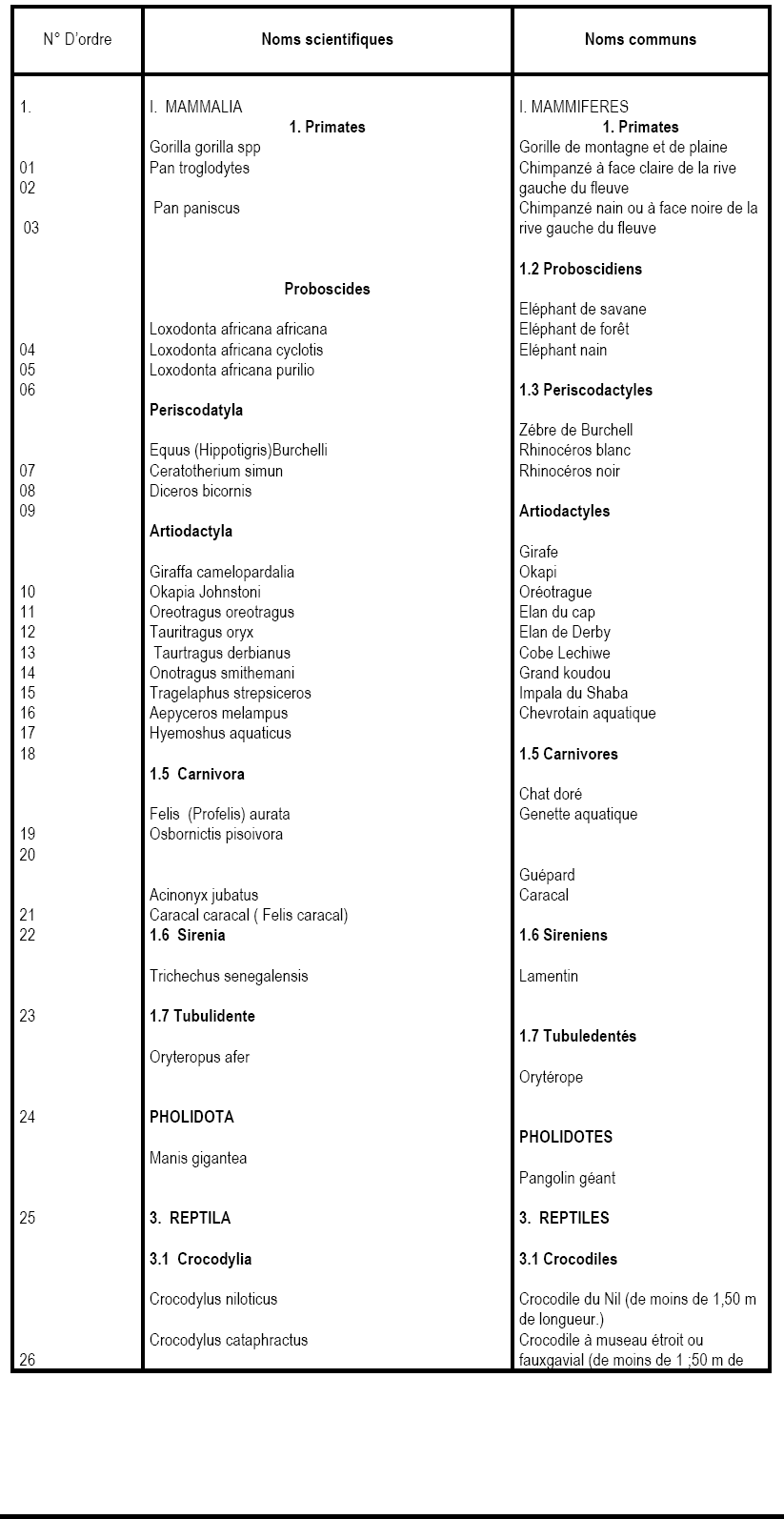 Tableau II. Animaux Partiellement  Protégés
