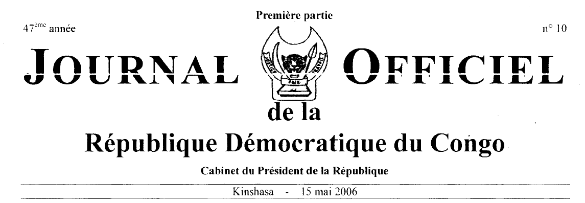 SOMMAIRE GOUVERNEMENT Ministère des Finances 10 mai 2006 - Arrêté ministériel n° 12/CAB/MIN/FINANCES 2006 portant mesures d'exécution du Décret n° 05/184 du 31 décembre 2005 abrogeant les dispositions du Décret n° 068 du 2 avril 1998 portant création du Franc fiscal col. 3. Ministère de la Justice 02 septembre 2004 - Arrêté ministériel n° 649/CAB/MIN/J/200· accordant la personnalité juridique à l'association sans but lucratif non confessionnelle dénommée « Association Nationale du Premier Peuple Autochtone Natif et Minorité Nationale Pygmées el République Démocratique du Congo. Plate-forme Nationale de Batwa» en sigle « ANPANMNP/P.F.N.B» asbl, col. 4. 30 décembre 2005 - Arrêté ministériel n0934/CAB/MIN/200 accordant la personnalité juridique à l'association sans but lucratif confessionnelle dénommée « Ministère Chrétien de Délivrance» e sigle « M. C. D. », col. 5. 31 décembre 2005 - Arrêté ministériel n° 985/CAB/MIN/J/2001 accordant la personnalité juridique à l'association sans but lucratif dénommée" Radio Maendeleo" en sigle « R.M. asbl ». col. 6. 03 avril 2006 - Arrêté ministériel n° 088/CAB/MIN/J/200 accordant la personnalité juridique à l'association sans but lucratif non confessionnelle dénommée « La Générale des Coopératives d'Actions Sociales» en sigle « GEEAS ". col. 7. 03 avril 2006 - Arrêté ministériel n° 089/CAB/MIN/J/200 accordant la personnalité juridique à l'association sans but lucratif confessionnelle dénommée « Eglise Rehoboth » en sigle « ER » col. 9. 11 avril 2006 - Arrêté ministériel n° 091/CAB/MIN/J/2006 accordant la personnalité juridique à l'organisation non gouvernementale dénommée « Débout Kalehe pour 1e Déve1oppement Intégral » en sig1e « DECADI » col.10 11 avril 2006 - Arrêté ministériel n° 092/ CAB/MIN/J/2006 accordant la personnalité juridique à l'association sans but lucratif confessionnelle dénommée « Eglise Evangélique du Saint Esprit a Congo» en sigle « EESEC », col. 11. 20 avril 2006 - Arrêté ministériel n° 098/ CAB/MIN/J/2006 accordant la personnalité juridique à l'association sans but lucratif confessionnelle dénommée « Eglise Evangélique Promesse de Die au Congo» en sigle « E.E.p.D.C. ». col 12. Ministère des Affaires Etrangères 23 avril 2003 - Accord de siège entre la République Démocratique du Congo et Innovative Ressources Management. INC « IRM » col. L1 Banque Centrale du Congo Banques agréées en République Démocratique du Congo 1 Banques dont le capital est détenu par des privés col. 17 2. Banques dont le capital est mixte. col. 17. Liste des Bureaux de Change agrées, col. 18 Messageries financières agréées, col. 19. Institutions de Micro Finance, col. 20. Coopératives d'Epargne et de Crédit. col. 20. COURS ET TRIBUNAUX . ACTES DE PROCEDURE Ville de Kinshasa R.A. 899 - Extrait d'une requête en matière administrative R.A.A.- Monsieur Diangenda Biku, col. 22. R.C. 92.782 - Assignation en confirmation de droit immobilier et en déguerpissement. - Monsieur Claude Booto et Ors, col. 23. R.PN 017/2005 - Signification de l'arrêt par défaut - Colonel Kakolele Bwambale. col. 25. R.P 18A06/IX - Citation directe - La société INGETRAC. col. 28. RP 18409/1 - Jugement - Madame Pinto -Monsieur Senghor Mobutu. col. 29. RP 5095/1 - Signification d'un jugement à domicile inconnu. - Mademoiselle Sabine Makambo, col. 31. R.C. 840/IV - Jugement - Monsieur Kilau Kayiba Senda. col. 32. RP. 18372/X - Citation directe par missive et à domicile inconnu - ; Monsieur Paul Lutgen - La société SEAPOINT, col. 34. RH 3224 - Signification-Commandement - La société Chance du Jour sprl. col. 34. Ville de Bandundu R.C.A. 926 - Notification d'appel et assignation à domicile inconnu - Monsieur Sumbu Micho. col. 37. ANNONCES ET A VIS Banque Commerciale du Congo Convocation. col. 30. Union de Banques Congolaises Avis de convocation ( 1 ), col. 39. Avis de convocation (2), col. 39. Déclaration de pertes de pièces col. 39.