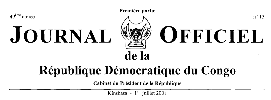 SOMMAIRE PRESIDENCE DE LA REPUBLIQUE 10 juin 2008 - Loi n° 08/005 portant financement public des partis politiques, col. 5. Exposé des motifs, col. 5. Loi, col. 6. GOUVERNEMENT Cabinet du Ministre d'Etat près le Président de la République 05 juillet 2007 - Arrêté ministériel n° 001/PR/CAB/MINET/2007 portant nomination du personnel politique du Cabinet du Ministre d'Etat près le Président de la République, col. 10. 05 juillet 2007 - Arrêté ministériel n° 002/PR/CAB/MINET/2007 portant nomination du personnel politique du Cabinet du Ministre d'Etat près le Président de la République, col. Il. Ministère de la Justice 14 février 2005 - Arrêté ministériel n° 718/CAB/MIN/J/2005 accordant la personnalité juridique à l'association sans but lucratif confessionnelle dénommée « Eglise le Petit Troupeau du Christ» en sigle « E.P.T.C. », col. 12. 05 septembre 2005 - Arrêté ministériel n° 858/CAB/MIN/J/2005 accordant la personnalité juridique à l'association sans but lucratif non confessionnelle dénommée « ZOE », col. 13. 23 novembre 2007 - Arrêté ministériel n° 0414/CAB/MIN/J/2007 accordant la personnalité juridique à l'association sans but lucratif non confessionnelle dénommée « Tifie Humanitarian Fondation» en sigle « T.H.F. », col. 14. Ministère de la Justice et Droits Humains 08 février 2008 - Arrêté n° 0448/CAB/MIN/J &DH/2008 portant nomination des membres du Cabinet du Ministre de la Justice et Droits Humains, col. 15. 19 juin 2008 - Arrêté ministériel n0 027/CAB/MIN/J&DH/2008 portant abrogation de l'Arrêté n° 0185/CAB/MIN/J/2007 du l er approuvant la nomination des personnes chargées de l'administration ou de la direction de l'association sans but lucratif confessionnelle dénommée « Message du Graal au Congo », col. 17. 21 juin 2008 - Arrêté ministériel n° 028/CAB/MIN/J&DH/2008 approuvant les modifications apportées aux statuts et la nomination des personnes chargées de l'administration ou de la direction de l'Association sans but lucratif confessionnelle dénommée « Message du Graal au Congo», col. 18. Ministère de l'Urbanisme et Habitat 03 avril 2008 . Arrêté ministériel n° 039/CAB/MIN.URBHAB/IW/2008 rapportant l'Arrêté ministériel n° 005/CAB/MIN. URB-HAB/2006 du 24 mars 2006 portant désaffectation d'un immeuble du domaine privé de l'Etat dans la Ville de Kinshasa, col. 19. Ministère des Affaires Foncières 14 février 2008 - Arrêté ministériel n° 016/CAB/MlN/ AFF. FONC/2008 portant création d'une parcelle de terre n° 31402 à usage agricole du plan cadastral de la Commune de N'sele, quartier Kimpoko, dans la Ville de Kinshasa, col. 20. 14 février 2008 - Arrêté ministériel n° 017 /CAB/MIN/ AFF.FONC/2008 portant création d'une parcelle de terre n° 11.450 à usage public du plan cadastral de la Commune de Masina, Ville de Kinshasa, col. 21. 24 mars 2008 - Arrêté ministériel n° 024 /CAB/MIN/AFF. FONC/2008 portant création et mise à la disposition de l'hôtel de Ville de Kinshasa d'une parcelle de terre na 8507 du plan cadastral à usage d'utilité publique dans la Commune de Kalamu, Ville de Kinshasa, col. 22. 24 mars 2008 - Arrêté ministériel n° 026 /CAB/MIN/AFF.FONC/ 2008 portant création et mise à la disposition de l'hôtel de Ville de Kinshasa d'une parcelle de terre n° 2626 du plan cadastral dans la Commune de Kinshasa, Ville de Kinshasa, col. 22. 14 avril 2008 - Arrêté ministériel n° 035 /CAB/MIN/AFF.FONC/ 2008 portant création d'une parcelle de terre n° 4562 à usage agricole du plan cadastral de la Commune de Maluku, Ville de Kinshasa, col. 23. 26 mai 2008 - Arrêté ministériel n° 041/CAB/MIN/ AFF.FONC/ 2008 portant création d'une parcelle de terre na 4556 à usage social du plan cadastral de la Commune de Maluku, Ville de Kinshasa, col. 24. 27 mai 2008 - Arrêté ministériel n° 049/CAB/MIN/AFF.FONC/ 2008 rapportant l'Arrêté ministériel n° 105/CAB/MIN/ AFF.FONC/ 2007 du 02 août 2007 portant déclaration d'un bien sans maître et portant reprise dans le domaine privé de l'Etat de la parcelle na 378 du plan cadastral de la Commune de Limete à Kinshasa, col. 25. 28 mai 2008 - Arrêté ministériel n° 050/CAB/MIN/AFF.FONC/ 2008 portant création d'une parcelle de terre n° 36022 à usage agricole du plan cadastral de la Commune de Maluku, Ville de Kinshasa, col. 26. 28 mai 2008 - Arrêté ministériel n° 051/CAB/MIN/AFF.FONC/ 2008 portant création d'une parcelle de terre n° 4461 à usage agricole du plan cadastral de la Commune de Maluku, Ville de Kinshasa, col. 27. 28 mai 2008 - Arrêté ministériel n° 052/CAB/MIN/AFF.FONC/ 2008 portant création d'une parcelle de terre n° 47585 à usage agricole du plan cadastral de la Commune de N'sele, quartier Kimpoko, dans la Ville de Kinshasa, col. 28. 28 mai 2008 - Arrêté ministériel n° 053/CAB/MIN/AFF.FONC/ 2008 portant création d'une parcelle de terre n° 3322 à usage social du plan cadastral de la Commune de Maluku, Ville de Kinshasa, col. 29. 2S mai 2008 - Arrêté ministériel n° 055 /CAB/MIN/AFF.FONC/ 2008 portant création d'une parcelle de terre n° 45252 à usage agricole du plan cadastral de la Commune de N'sele, Quartier Bibwa Mangengenge, dans la Ville de Kinshasa, col. 30. 31 mai 2008 - Arrêté ministériel n° 056/CAB/MIN/AFF.FONC/ 2008 portant réglementation de fabrication et vente de borne cadastrale, col. 31. 02 juin 2008 - Arrêté ministériel n° 058/CAB/MIN/AFF.FONC/ 2008 portant création d'une parcelle de terre n° 51061 du plan cadastral de la Commune de Mont-Ngufula, col. 32. 09 juin 2008 - Arrêté ministériel n° 062/CAB/MIN/AFF.FONC/ 2008 portant création d'une parcelle de terre n° SR 578 à usage agricole du plan cadastral territoire de Irumu, district de l'Ituri, localité de Nyanfuka à Bunia, province orientale, col. 33. 03 juin 2008 - Arrêté ministériel n° 063/CAB/MIN/AFF.FONC/ 2008 portant création d'une parcelle de terre n° 47.4SS à usage agricole du plan 